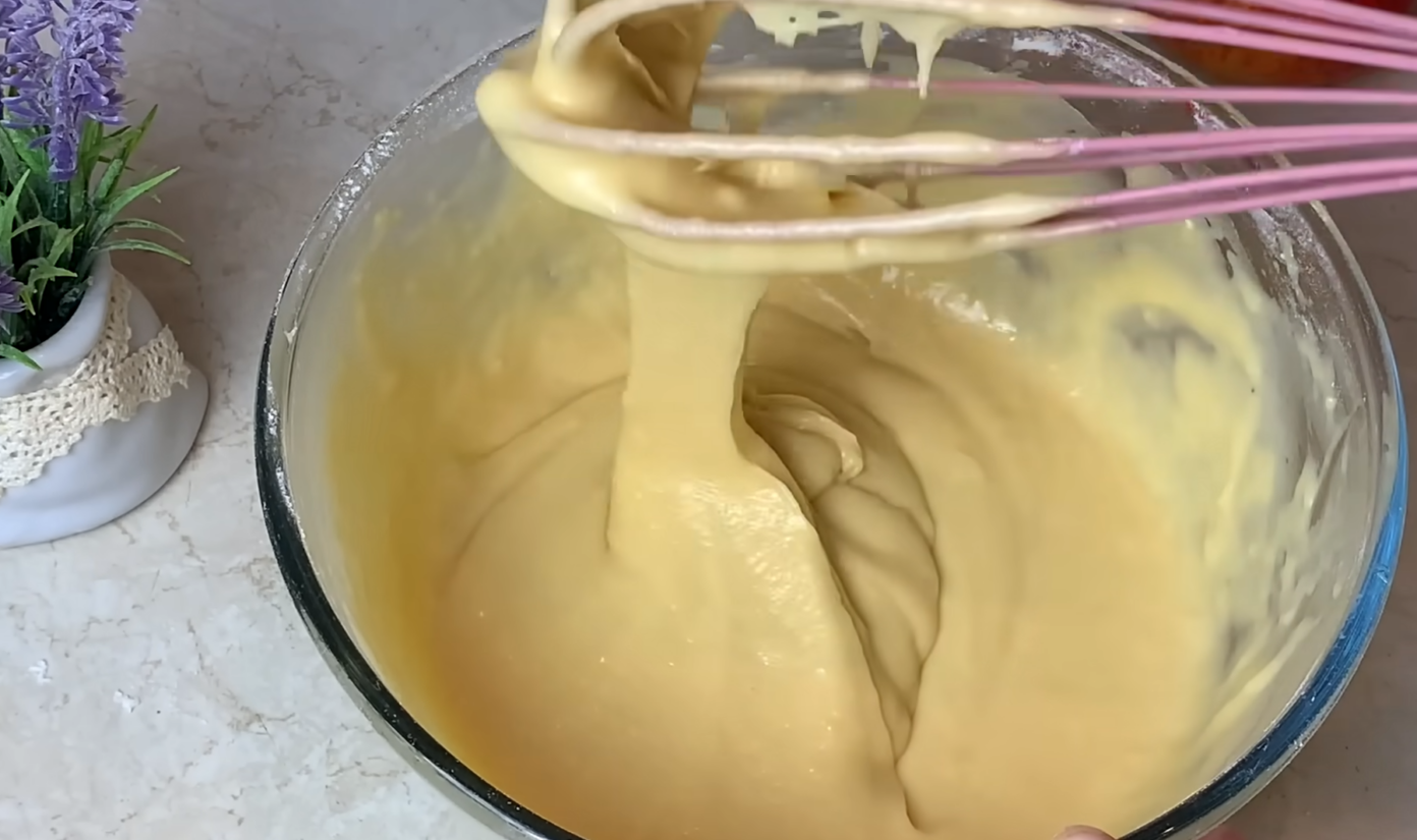Supilkite pieną ir išmaišykite. Ištirpinkite sviestą ir supilkite į mišinį. Išmaišykite plaktuvu. Porcijomis suberkite miltus ir iš karto išmaišykite, kad neliktų gumuliukų. Tešla gausis tiršta, kaip kepiniams