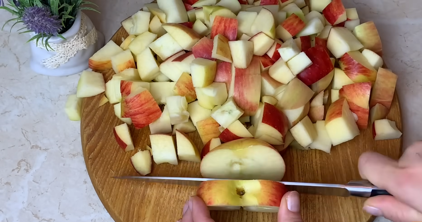 Imkite obuolius, geriausia saldžiarūgščius. Supjaustykite ir išimkite šerdį. Nereikia lupti. Supjaustykite kubeliais