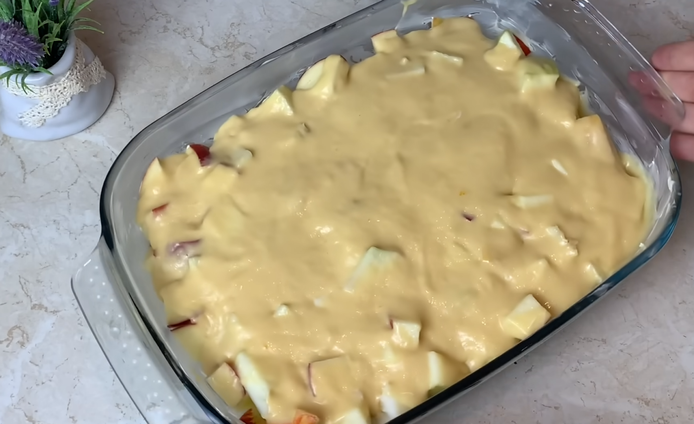 . Kepimo formą ištepkite aliejumi. Išdėliokite visus obuolius. Tolygiai paskirstykite ir užpilkite tešla. Dėkite į 180 laipsnių temperatūros orkaitę 30-35 minutėms.