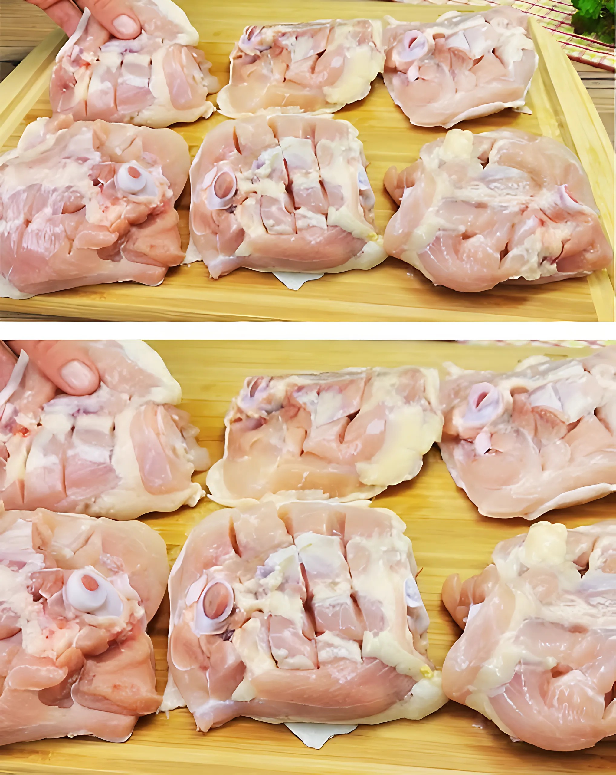 - Vištienos šlaunelės iš abiejų pusių įpjaunamos. Pabarstykite jas druska ir mėsos prieskoniais.