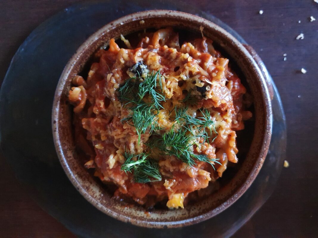 Sotus, spalvingas ir sveikas baklažanų bei pomidorų troškinys, tinkantis veganams, vegetarams, žmonėms, netoleruojantiems glitimo.