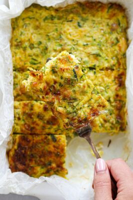 Į ją supilti cukiniją, sūrį, žoleles, išmaišyti iki vientisos masės. Kepimo formą ištepkite liesu arba sviestiniu aliejumi. Supilkite tešlą į formą ir pašaukite į 180 laipsnių temperatūros orkaitę 40-50 minučių