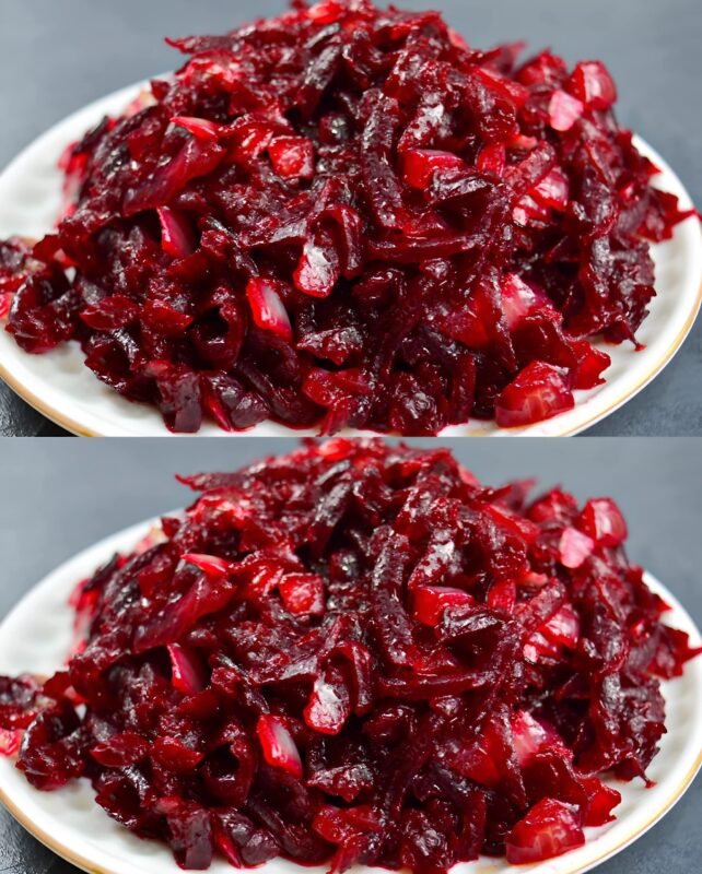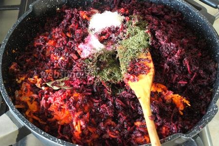 Tada sudėkite burokėlius, išmaišykite ir palikite troškintis ant silpnos ugnies. Suberkite druską ir cukrų, dar kartą išmaišykite ir virkite apie 7 minutes. Tada sudėkite prieskonius, pipirų mišinį, smulkintas žoleles ir pomidorų pastą. Palikite troškintis dar 10-15 minučių. Jei norite, prieskoniui galite įdėti česnako.