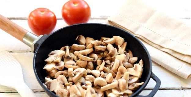 Nuplaukite ir nuvalykite grybus. Nusausinkite popieriniu rankšluosčiu ir stambiai supjaustykite. Suberkite gabalėlius į įkaitintą keptuvę. Grybų sultys neleis jiems sudegti, laikas skysčiui išgarinti – 7 minutės. Ugnis vidutinė. Neuždenkite indo dangčiu, leiskite grybams gerai apvirti.