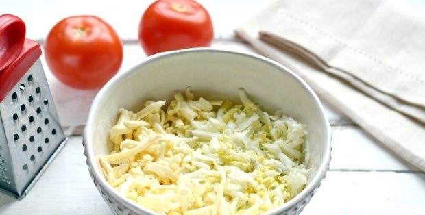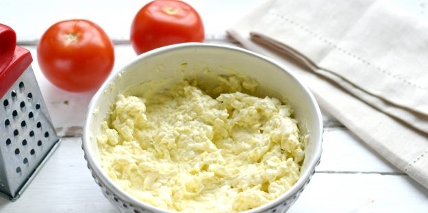 Kiaušinius išvirkite, nulupkite ir sutarkuokite stambia tarka. Lydytą sūrį taip pat sutarkuokite stambiomis skylutėmis. Visus ingredientus sumaišykite.