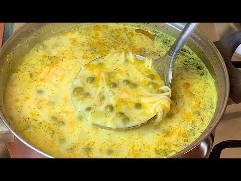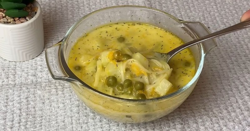 4. Sudėkite tarkuotą kreminio skonio lydytą sūrį ir leiskite jam ištirpti sriuboje. Po poros minučių pasūdykite ir sudėkite makaronus bei žirnelius.
