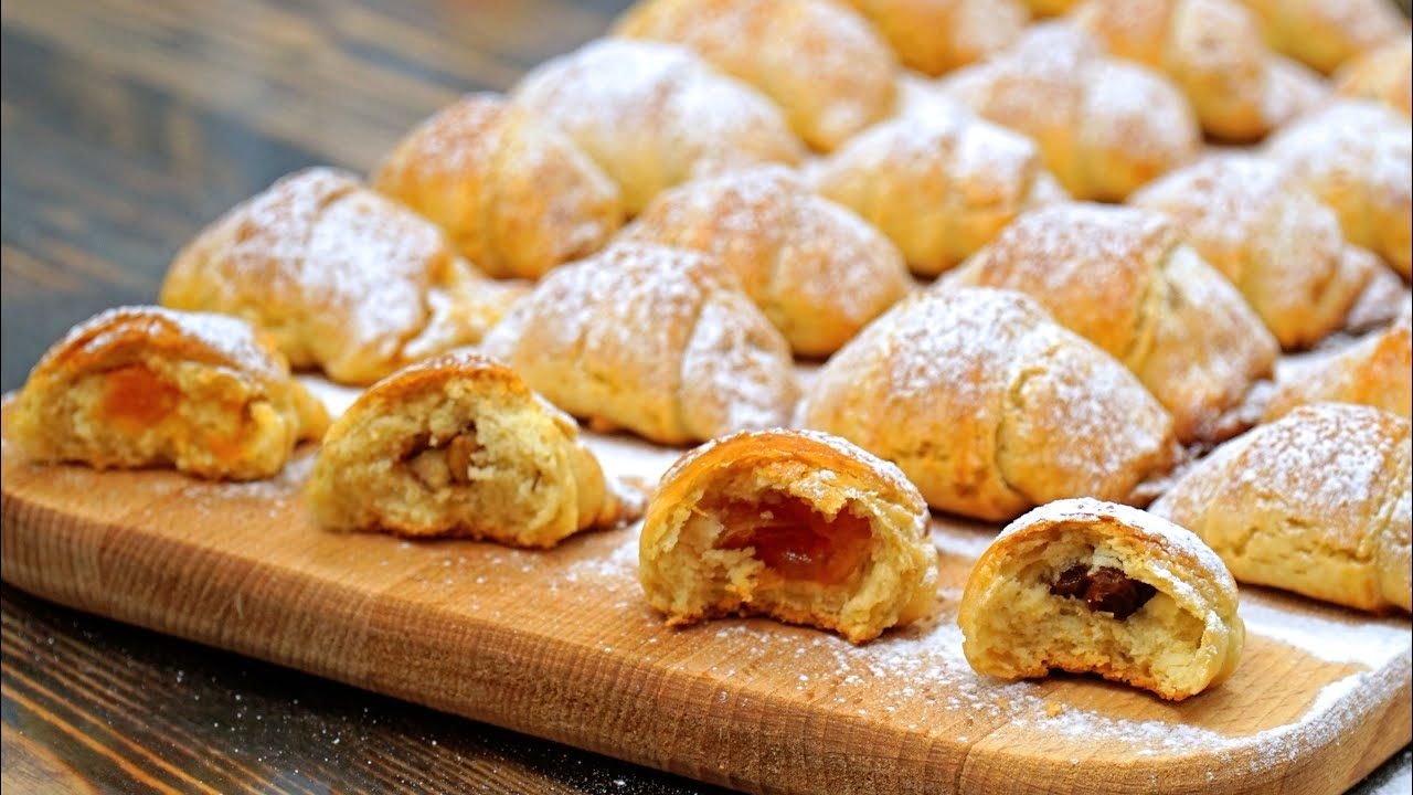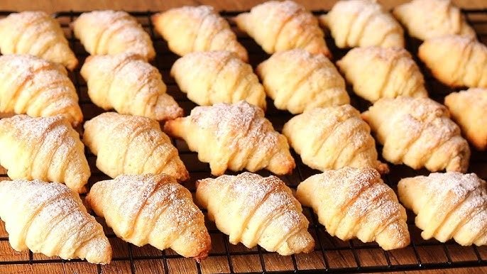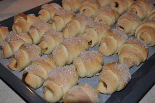 Kiekvienas tešlos gabalėlis susukamas į tvarkingą ritinėlį, pradedant nuo plačiosios dalies ir einant prie siaurojo galo. Ruošiniai išdėliojami ant kepimo skardos nedideliu atstumu vienas nuo kito. Tada jie vėl penkiolikai minučių dedami į šaldytuvą – taip tešla tampa trapesnė ir puresnė, kai yra paruošta.