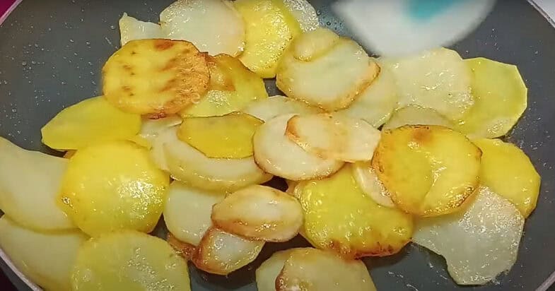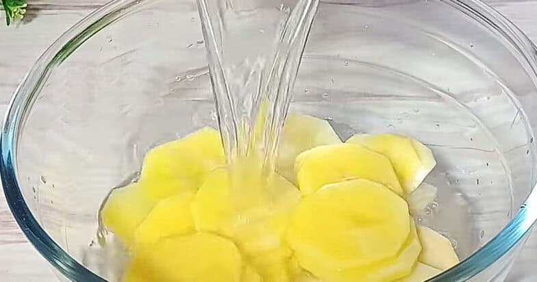 Bulves nuplaukite, nulupkite ir supjaustykite apskritimais. Nuplaukite po šaltu vandeniu ir nusausinkite ant popierinių rankšluosčių.