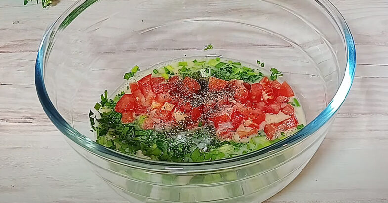 Sudėkite bulves ir kepkite 10-13 minučių, kol paruduos. Suplakite kiaušinius su grietine. Į juos sudėkite pomidorus, žoleles. Druskos, pipirų ir išmaišykite. Supilkite mišinį ant bulvių