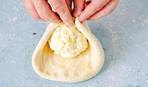Išminkyta tešla uždengiama ir paliekama pailsėti. Jei ji vis dar per skysta, galima įberti dar šiek tiek miltų. Kol tešla ilsisi, paruoškite įdarą: sūrį sutarkuokite stambia tarka ir sumaišykite su kiaušiniu. Tešla padalijama į 9 dalis, iš kurių formuojami maži plokštainiai. Į kiekvieno jų vidurį dedamas sūrio įdaras, o kraštai surenkami į maišelį, kuris atsargiai išvyniojamas, neleidžiant įdarui iškristi.