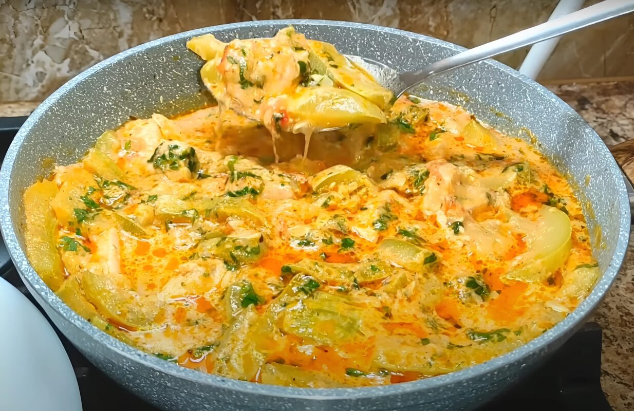 Troškintos cukinijos, vištiena grietinės padaže – puikus sotus, bet kartu ir lengvas patiekalas. Jį galima patiekti ir pietums, ir vakarienei. Grietinė suteikia patiekalui minkštumo, lengvos rūgštelės, subtilios struktūros ir sujungia visus komponentus į vientisą masę. Po terminio apdorojimo viskas tampa minkšta, persmelkta vienas kito skonio. Duete su bulvių koše, ryžiais ar šviežia duona jie suteikia nepamirštamą valgymo malonumą.