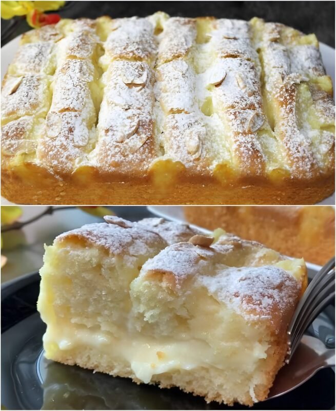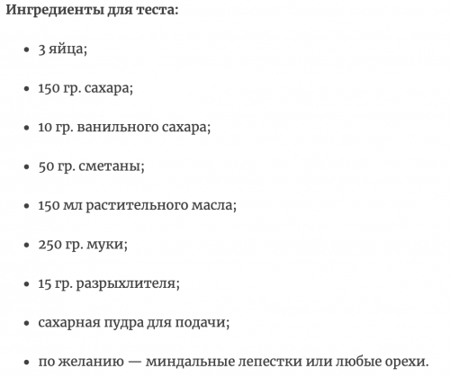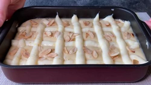 Dabar pagrindas. Giliame inde sumaišomi kiaušiniai, cukrus, vanilė, grietinė, sviestas, raugas ir iš anksto persijoti miltai. Paruošta tešla supilama į formą ir išlyginama. Ant viršaus iš konditerinio maišelio tinklelio forma išdėliojamas kremas. Jei norima, paviršių galima pabarstyti migdolų žiedlapiais.