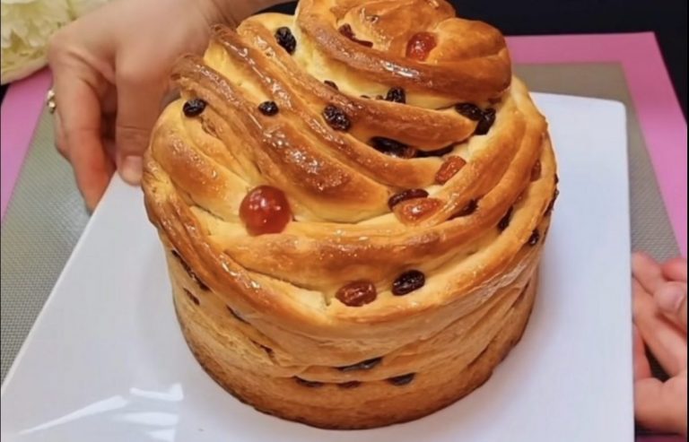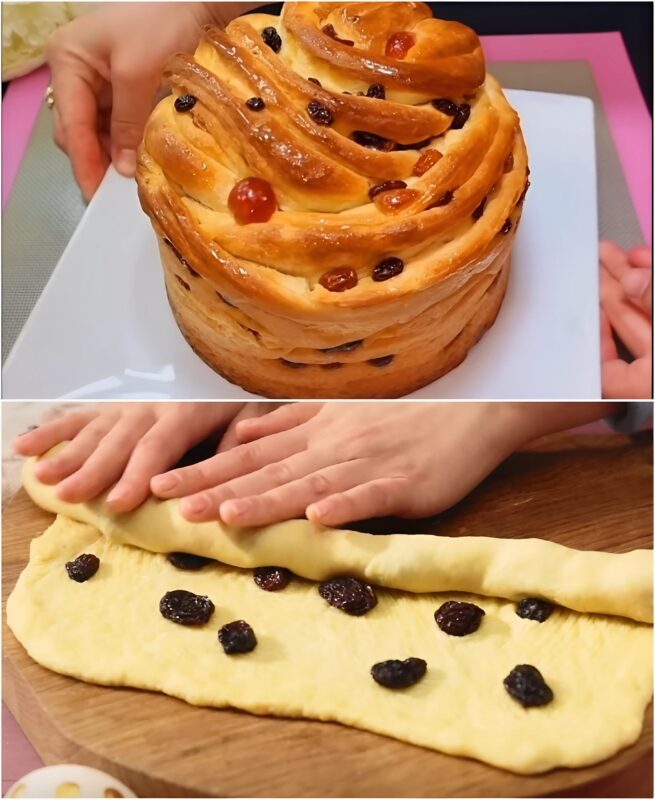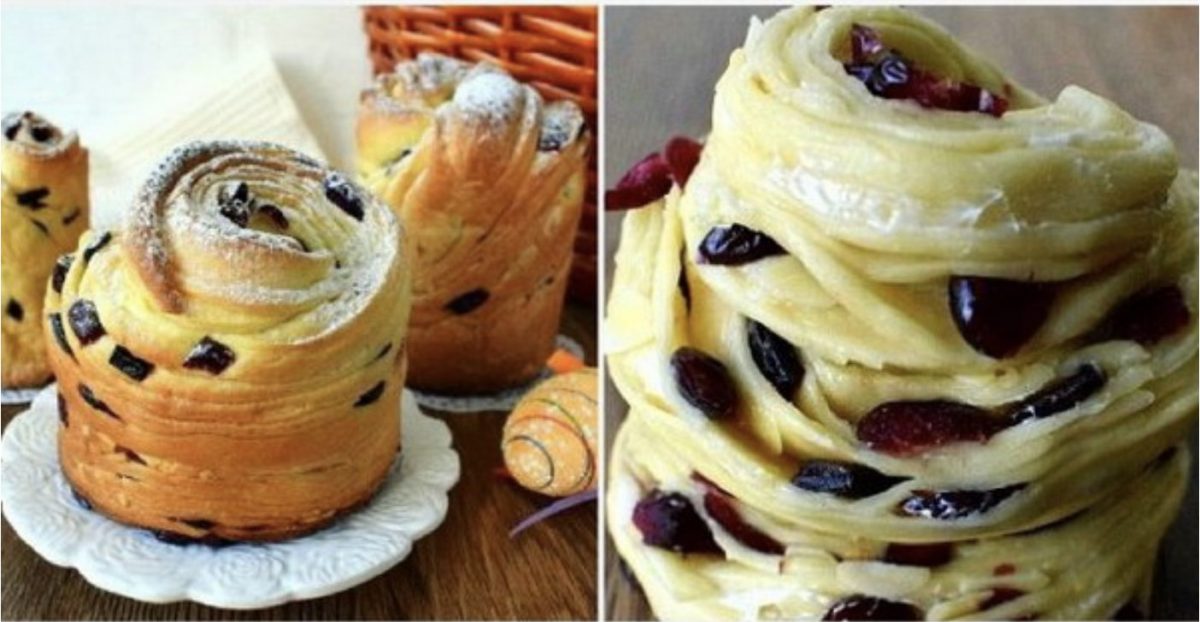 Kepimo indą uždenkite maistine plėvele. Perkelkite į ją gabalėlius ir palikite juos 20 minučių pastovėti šiltai. Kepkite 200 laipsnių temperatūroje 10 minučių. Sumažinkite temperatūrą iki 180 laipsnių, uždenkite kulichi folija ir kepkite 25 minutes. Atvėsinkite ir apibarstykite cukraus pudra.