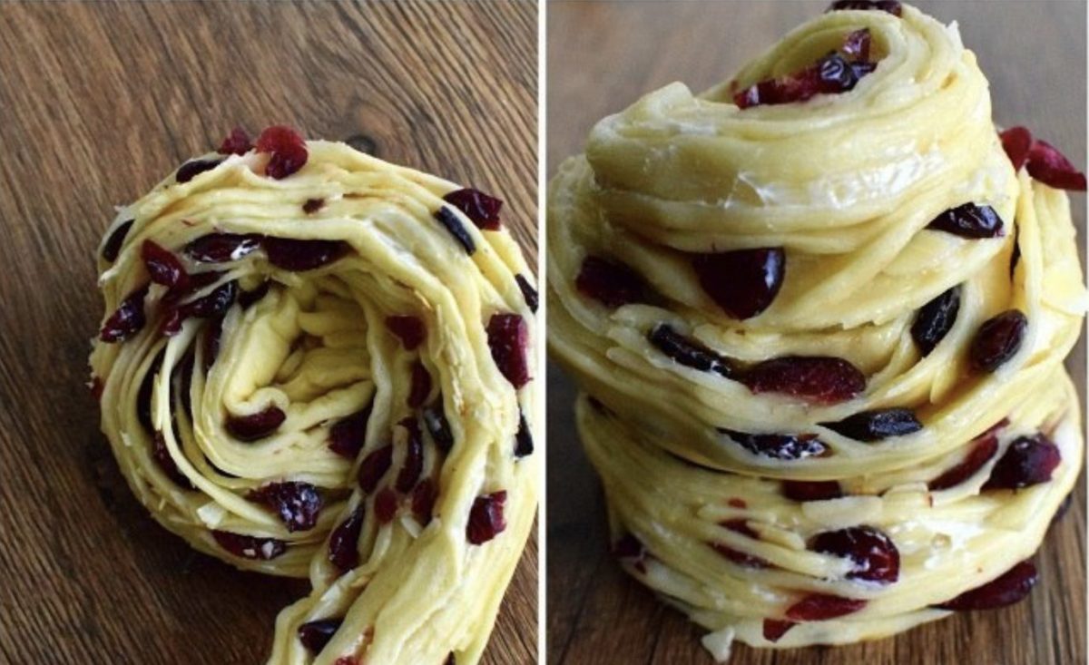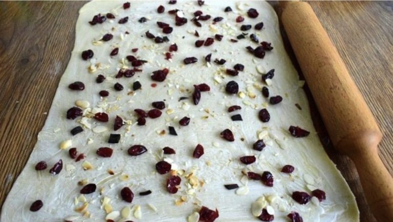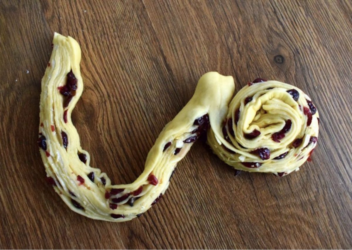 Padalykite tešlą į gabalėlius ir iškočiokite į ploną stačiakampio formą. Aptepkite sviestu ir apibarstykite spanguolių ir migdolų mišiniu. Taip pat įberkite muskato riešuto. Viską susukite į ritinėlius ir vienoje pusėje perpjaukite išilgai vos ne prie krašto. Vieną pusę susukite į rutuliuką, o kitą uždėkite ant jo