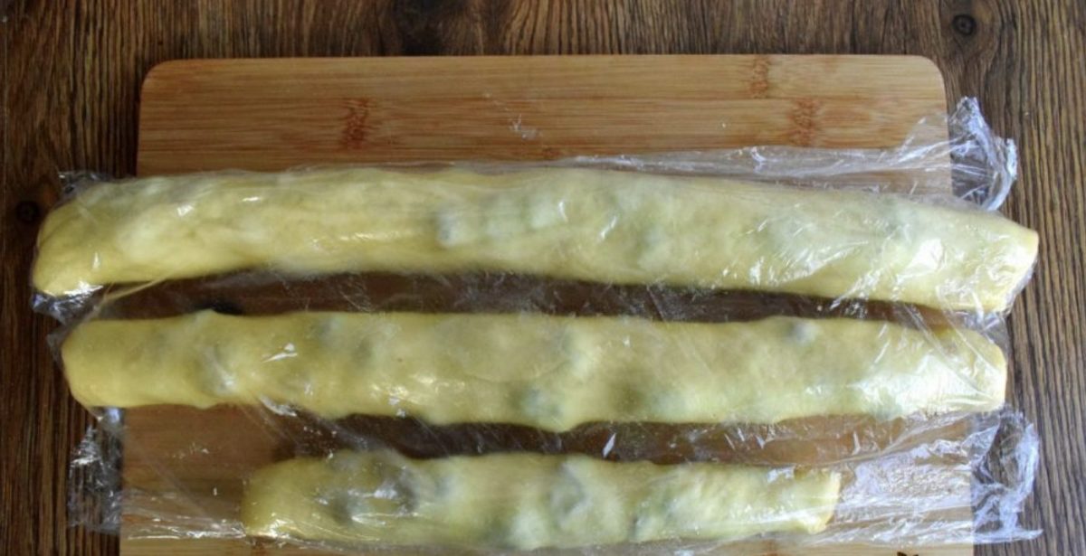 Gilų dubenį patepkite aliejumi, sudėkite į jį tešlą, šiek tiek patepkite sviestu ir uždenkite maistine plėvele. Pusantros valandos padėkite ją į šiltą vietą.