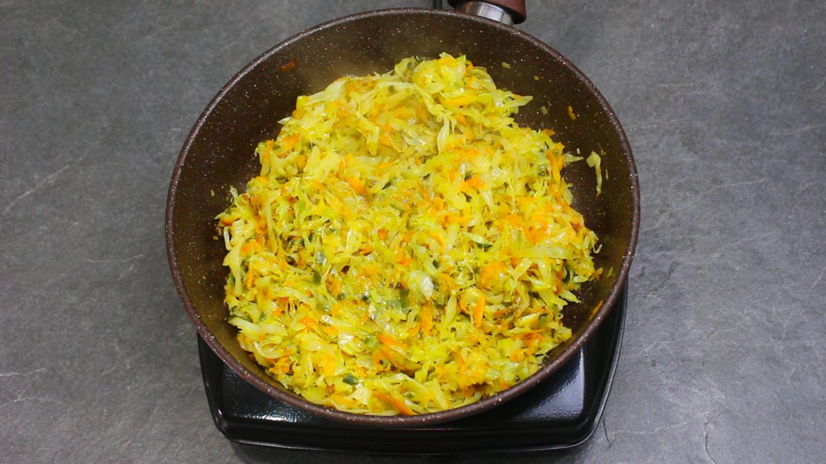 Keptuvėje reikia pakepinti smulkintą kopūstą ir tarkuotą morką. Prie jų pridėti porų