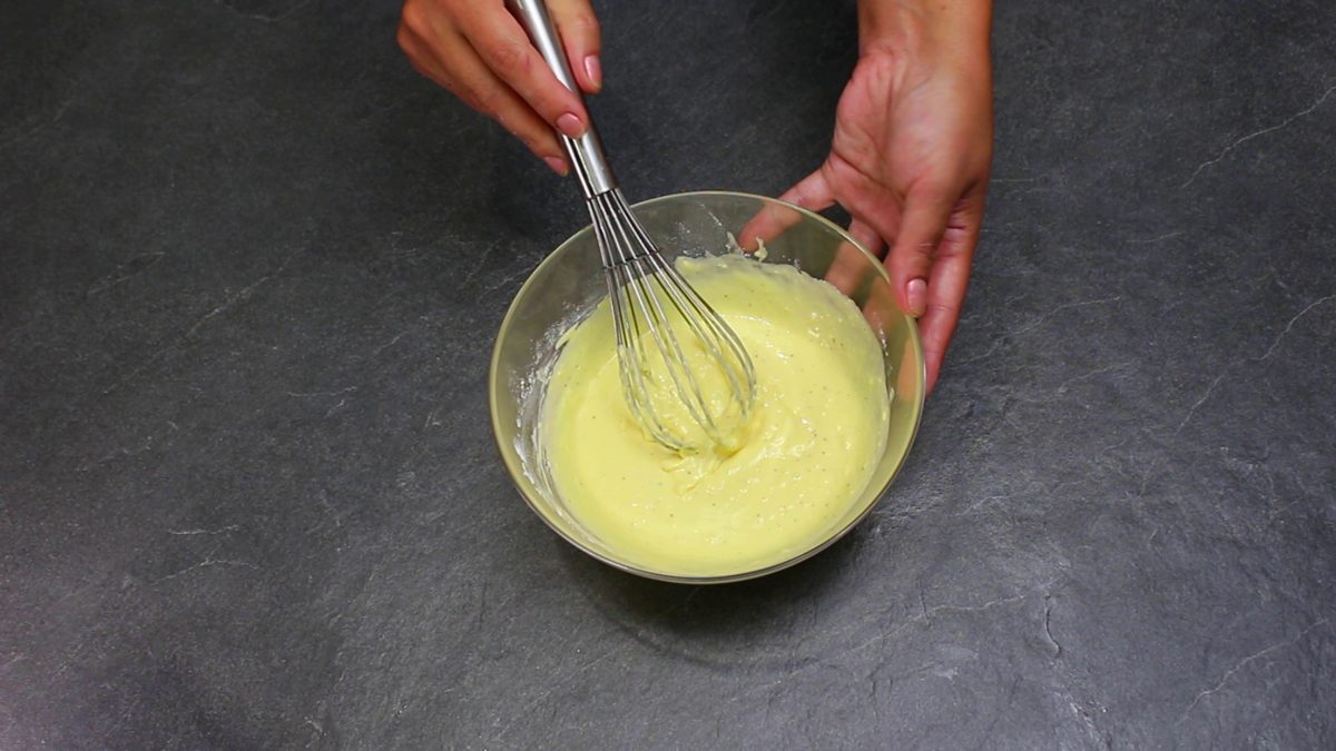 Dubenyje suplakite kiaušinius, supilkite grietinę, tarkuotą sūrį, miltus ir prieskonius. Kruopščiai išmaišykite plakikliu. Tešla paruošta.