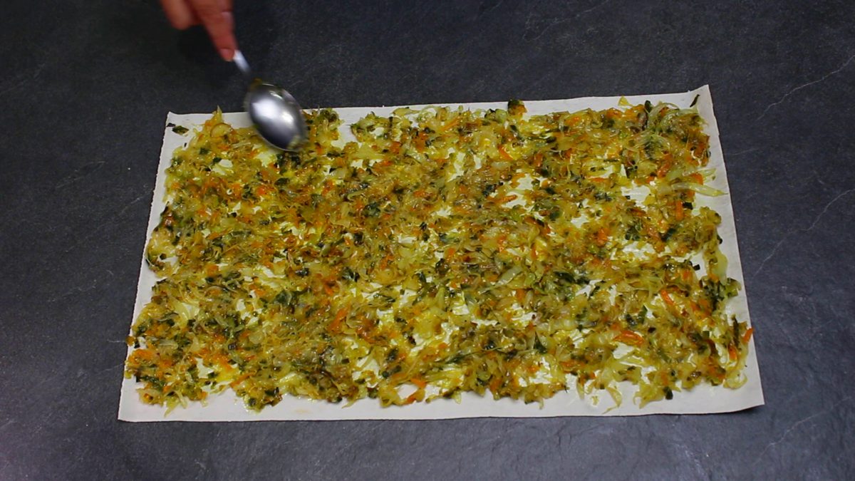 Paimkite lavašo lakštą. Ant jo tolygiai paskleiskite kopūstus
