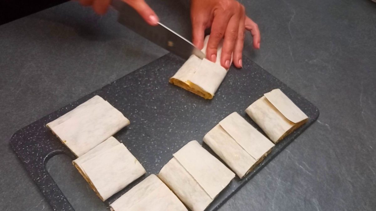 Atsargiai suvyniokite ir supjaustykite mažais gabalėliais