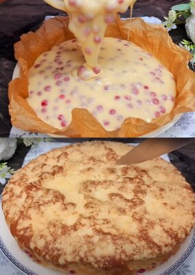 Ant formos dugno dėkite vieną pyragą. Ant viršaus tolygiai paskirstykite atvėsusį kremą. Uždenkite antruoju sluoksniu. Perkelkite tortą į šaldytuvą bent 2-3 valandoms, o geriau – per naktį. Taip kremas sutirštės ir stabilizuosis.