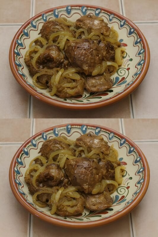 Patiekalas paruoštas patiekti. Mėgaukitės švelniomis keptomis kepenėlėmis su kvapniais svogūnais.
