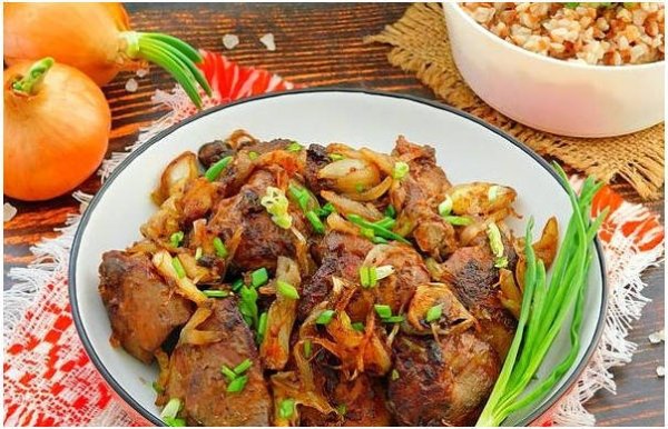 - Nuimkite nuo ugnies ir sudėkite iškeptas kepenis į lėkštę, ant viršaus uždėkite kepintų svogūnų.