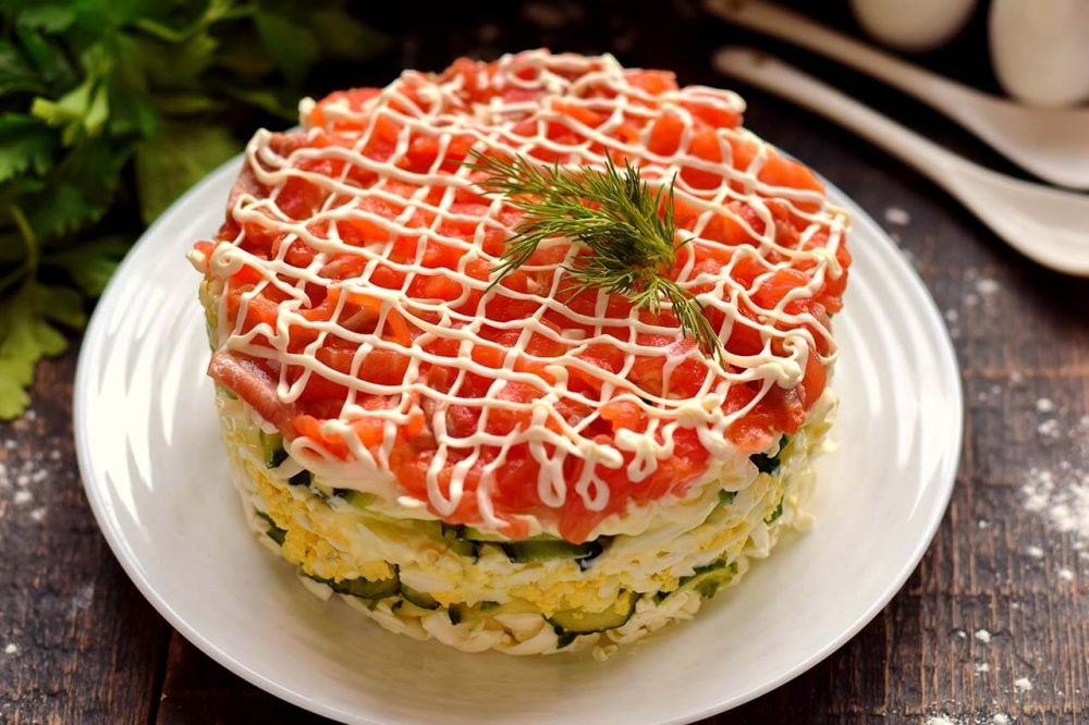 Galite vartoti bet kokią raudoną žuvį. Ją reikia smulkiai supjaustyti ir išdėlioti kaip paskutinį sluoksnį. Papuoškite majonezo tinkleliu. Salotos paruoštos, galite patiekti.