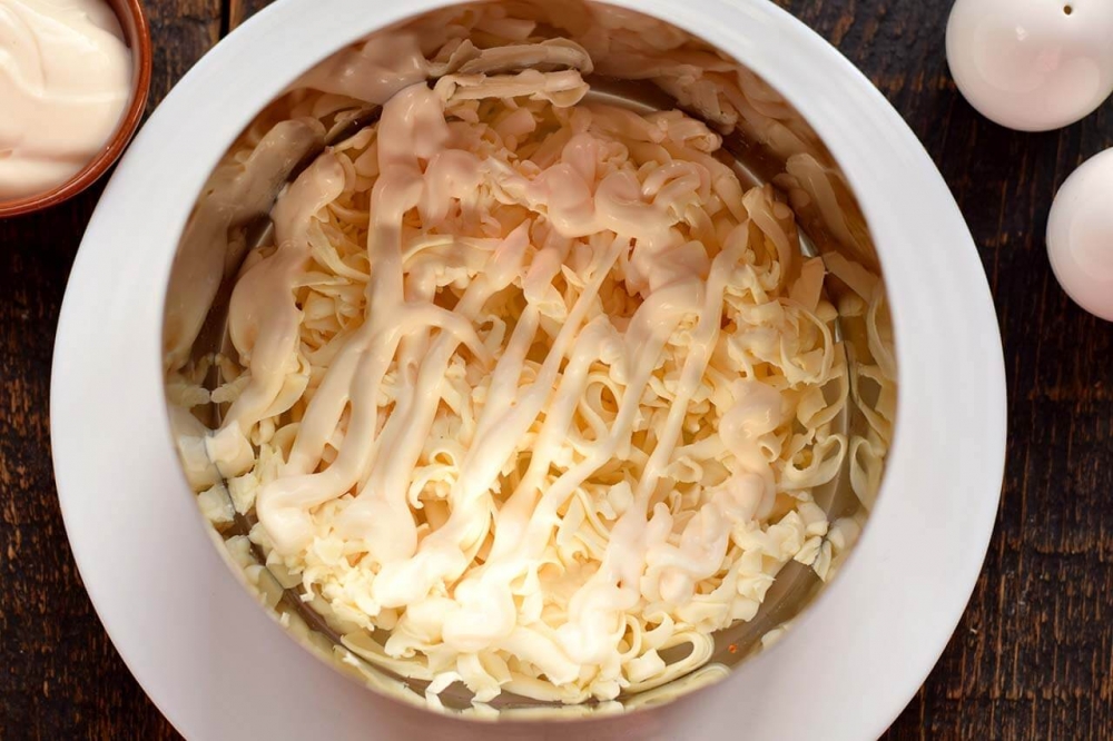 Lydytus sūrius sutarkuokite stambia tarka. Kad tarkuotus sūrius būtų lengviau tarkuoti, patartina juos 15 minučių atšaldyti šaldiklyje. Paruoštus sūrius išdėliokite lėkštėse, tolygiai paskleiskite ir padenkite plonu majonezo tinkleliu.