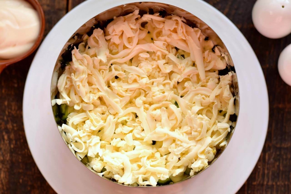 Išvirkite kiaušinius ir sutarkuokite juos smulkia tarka. Išklokite dar vieną sluoksnį ir padarykite majonezo tinklelį. Ant viršaus uždėkite dar vieną agurkų ir majonezo sluoksnį. Ant viršaus uždėkite likusius sūrius