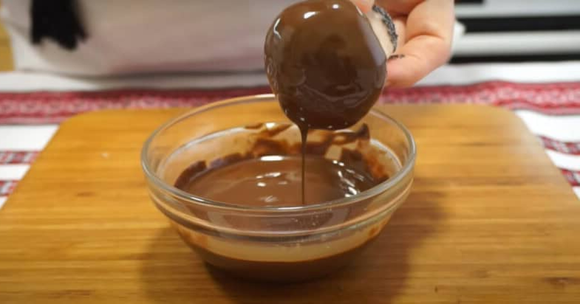 Ištirpinu šokoladą, sudedu sviestą ir išmaišau. Dabar į ištirpintą šokoladą pamerkiu kepurėles. Dedu juos ant pergamento ir palieku, kol šokoladas sustings.