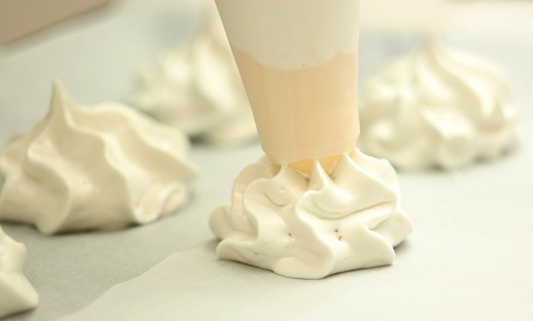 Gautą masę perkelkite į pergamentu išklotą kepimo skardą, naudodami konditerinį maišelį, kad zefyrai būtų gražūs. Palaukite, kol ji stabilizuosis. Galite palaukti apie valandą šaldytuve arba mėgautis iš karto, jei turite kantrybės.