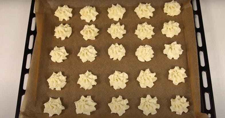 Tešla pripildyti konditerinį maišelį. Kepimo skardą išklokite pergamentu ir ant jos krėskite sausainius. Siųskite juos į iki 190 laipsnių įkaitintą orkaitę su įjungta konvekcija 10-11 minučių. Jei konvekcijos nėra, kepkite 200 laipsnių temperatūroje. Štai ir viskas, sausainiai paruošti