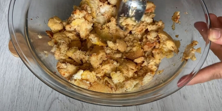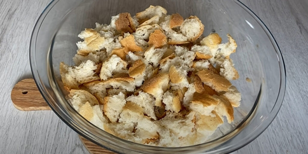 Duoną suplėšykite gabaliukais ir sudėkite į dubenį. Į ją įmušti kiaušinius, įberti druskos ir mėgstamų prieskonių. Po to supilti visą pieną ir kruopščiai išmaišyti šaukštu, kad gautųsi vientisa masė