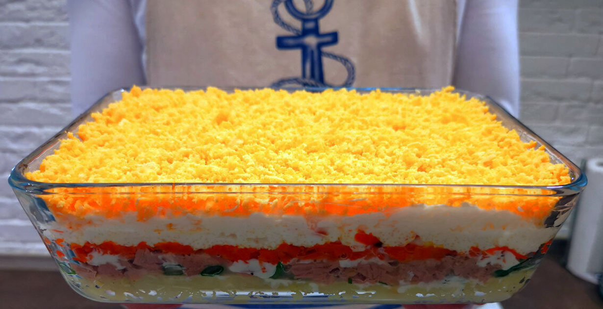 Prieš klojant sluoksnį baltymus reikia šiek tiek pasūdyti, įpilti majonezo, taip pat šiek tiek.