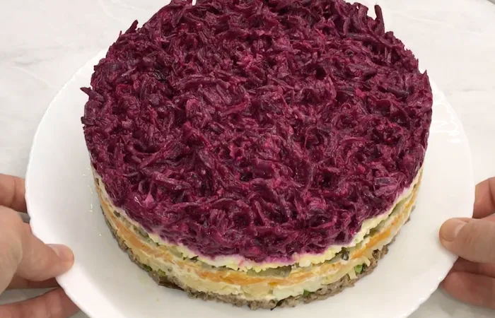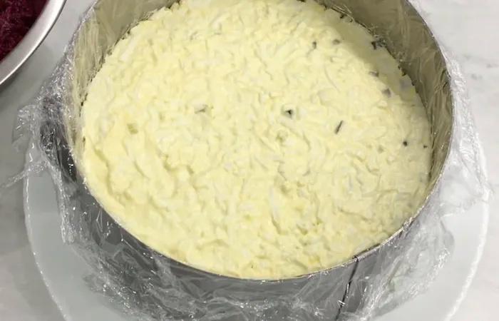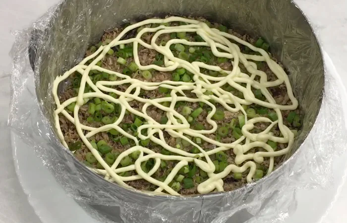 Kitas sluoksnis – sutarkuotos virtos bulvės, šiek tiek druskos ir taip pat aptepti majonezu. Toliau – sluoksnis virtų morkų, taip pat sutarkuotų stambia tarka, šiek tiek druskos ir užpilkite majonezu.