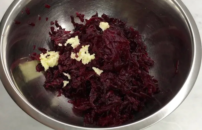 Burokėlius sutarkuokite stambia tarka, įberkite šiek tiek druskos, sudėkite smulkintą česnaką ir majonezą, gerai išmaišykite. Šia burokėlių mase užtepkite salotų viršaus.