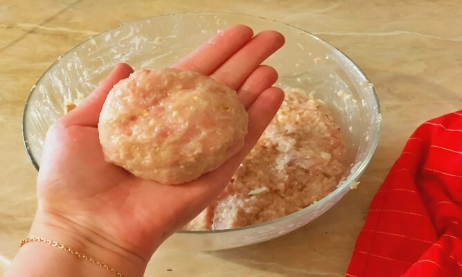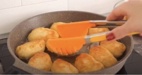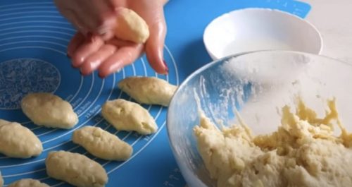 Dabar galite formuoti paplotėlius. Kad jie neliptų prie rankų, patepkite jas augaliniu aliejumi. Atplėškite nedidelį gabalėlį tešlos ir suformuokite dešrelę aštriais galais. Kepkite keptuvėje, kol paruduos iš abiejų pusių
