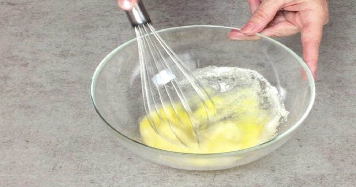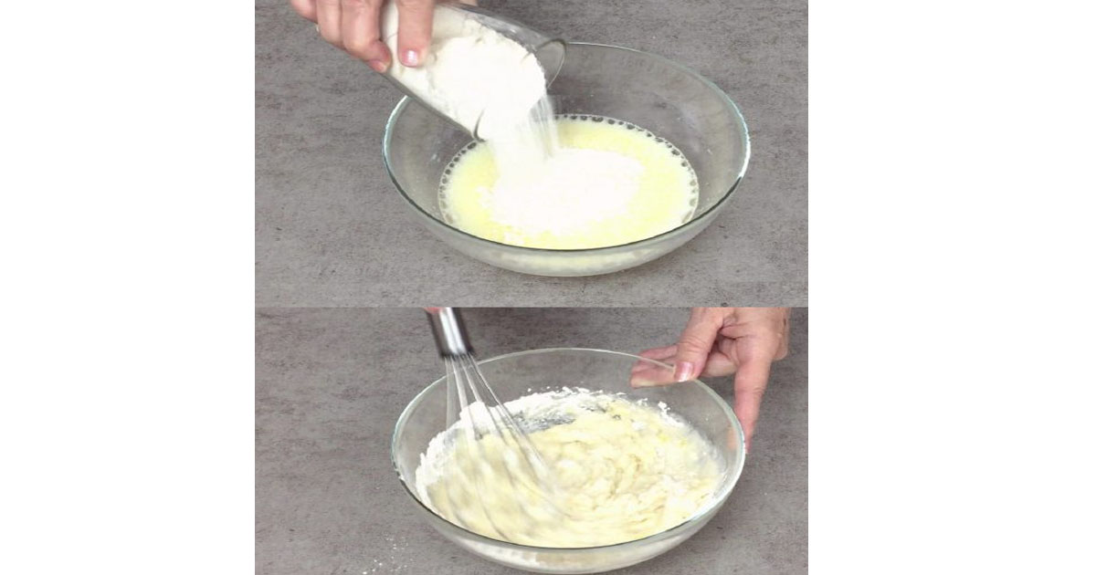 Įmuškite kiaušinį su žiupsneliu druskos. Įmaišykite paprastąjį ir vanilinį cukrų. Viską plakite plaktuvu iki vientisos masės. Supilkite pieną ir sviestą. Kruopščiai išmaišykite. Atsargiai, palaipsniui suberkite miltus ir kepimo miltelius. Greitai išmaišykite, kad nesusidarytų gumuliukų. Tešla turi būti vientisa. Ilgai maišyti nereikia.