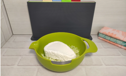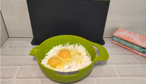 Ant cukinijos sudėkite varškę ir pamažu maišykite iki vientisos masės.