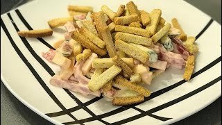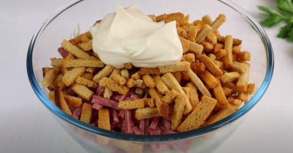 Visus paruoštus produktus sumaišykite, sudėkite kukurūzus, žirnelius ir džiūvėsėlius, tada užberkite tuo, ką mėgstate, – šį kartą naudojau grietinę. Išmaišykite ir iš karto patiekite – salotos bus gaivios, kvapnios ir labai apetitiškos.