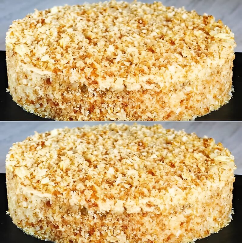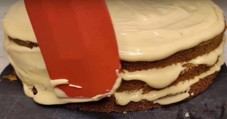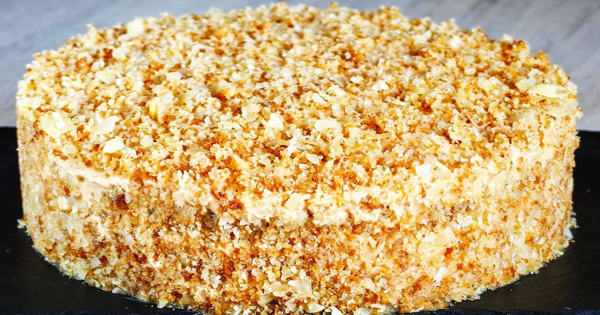 Kiekvieną sluoksnį aptepkite kremu, tuo pačiu kremu aptepkite viršų ir šonus, tada apibarstykite atraižų trupiniais.