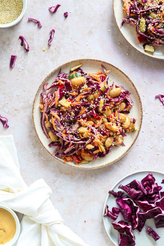 Raudonojo kopūsto salotos su riešutų sviesto padažu tiks ir kaip garnynas, ir kaip pagrindinis patiekalas. Galite pupelių ir nedėti, jeigu tieksite kaip garnyną. Padažui naudokite kuo skystesnį riešutų sviestą arba papildomai įpilkite kelis šaukštus vandens.