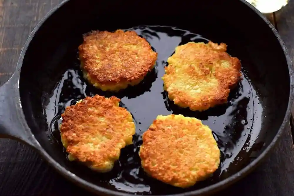 Įkaitinkite keptuvę su augaliniu aliejumi, šaukštu dėkite nedideles porcijas masės, suformuodami kepsnelius.