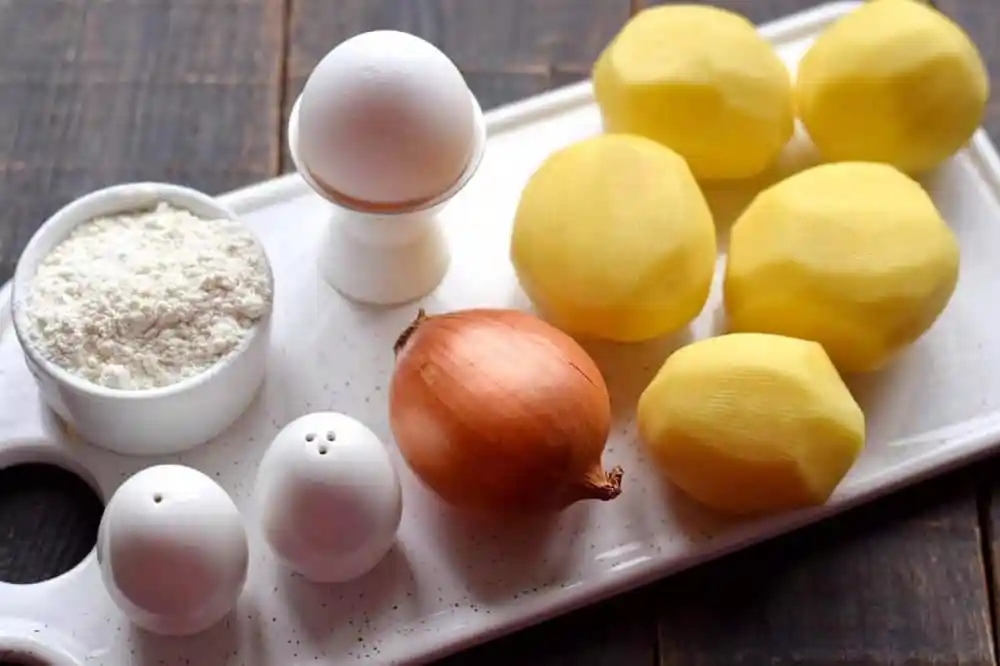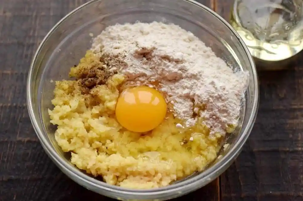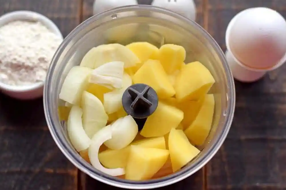Bulves ir svogūnus sumalkite blenderiu arba mėsmale, kad gautųsi smulki masė.