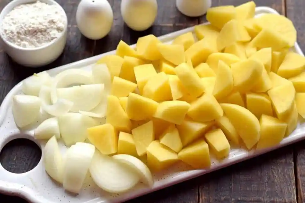 Bulves ir svogūnus nulupkite, nuplaukite ir supjaustykite nedideliais gabalėliais.