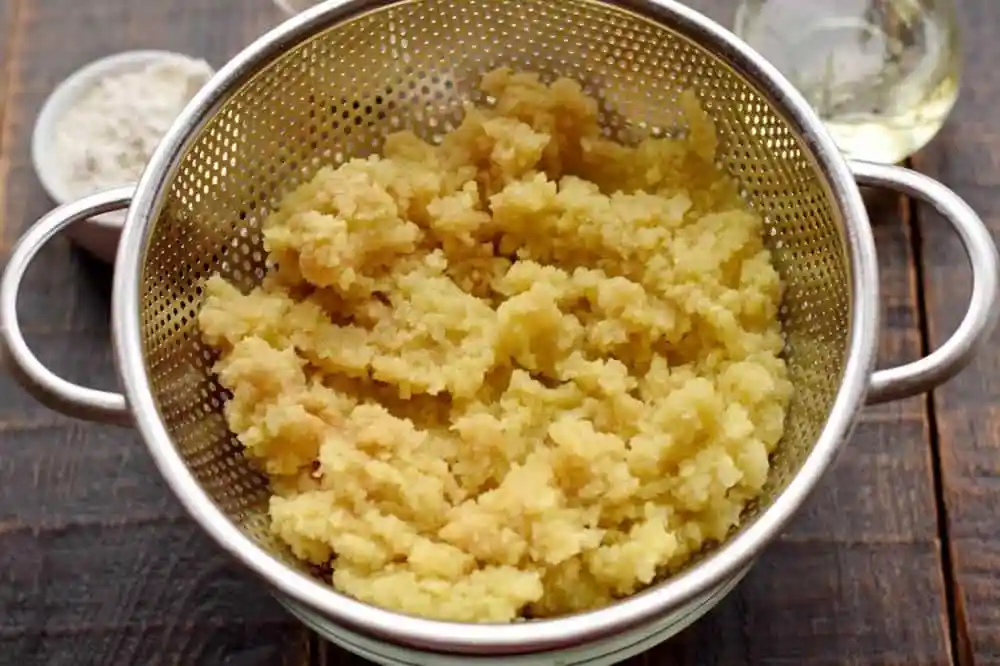 Sudėkite mišinį į gilų dubenį ir palikite 5 minutėms, kad bulvės prisitrauktų sulčių.