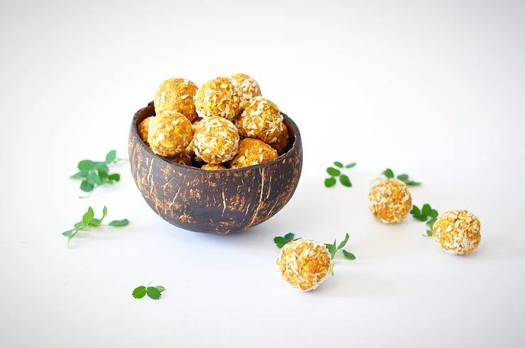 Suformuokite norimo dydžio rutuliukus ir apvoliokite kokosų drožlėse. Galite paįvairinimui naudoti sezamo sėklas, aguonas ar smulkintus riešutus.