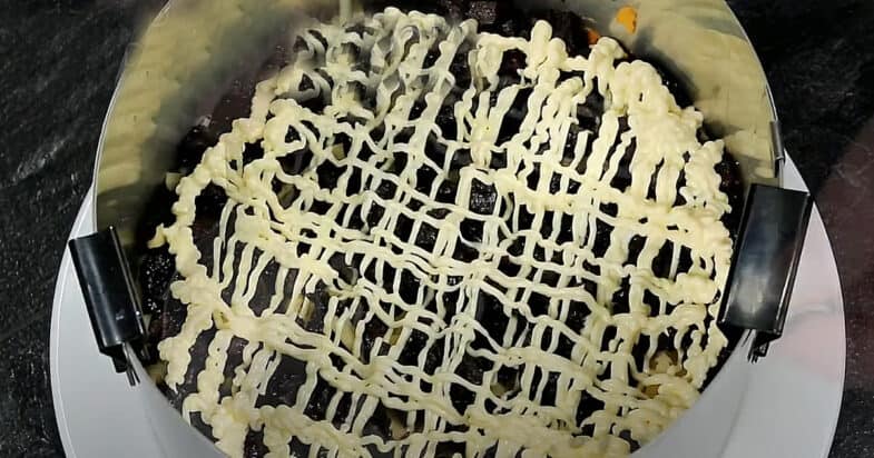 Sutarkuokite sūrį ir sudėkite jį kaip kitą sluoksnį. Supjaustytos džiovintos slyvos atiteks tarkuotam sluoksniui. Jas reikia ištepti majonezu.
