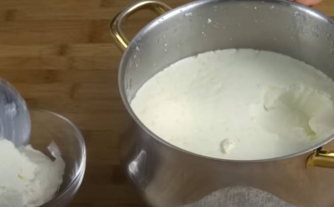 Į dubenį įdėkite 2 šaukštus jogurto. Į jį po truputį supilkite pieną. Gerai išmaišykite iki vientisos masės. Supilkite į puodą ir dar kartą išmaišykite. Pasirodys nedidelės kruopelės – tai normalu