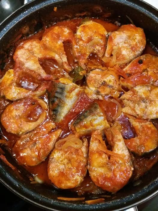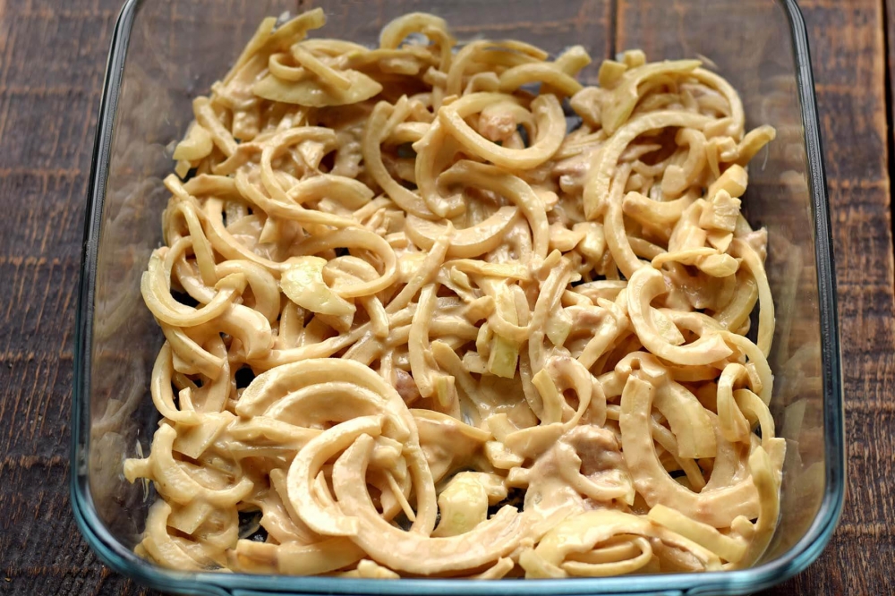 Yra dar vienas įdomus receptas. Žuvis taip pat kepama su svogūnais, tačiau į ją dedama garstyčių. Ji gaunasi labai skani. Marinatas neatpažįstamai pakeičia mėsą. Susidaro įspūdis, kad ragaujate karštai rūkytą žuvį. Paruošiama iš minimalaus produktų kiekio ir labai greitai.